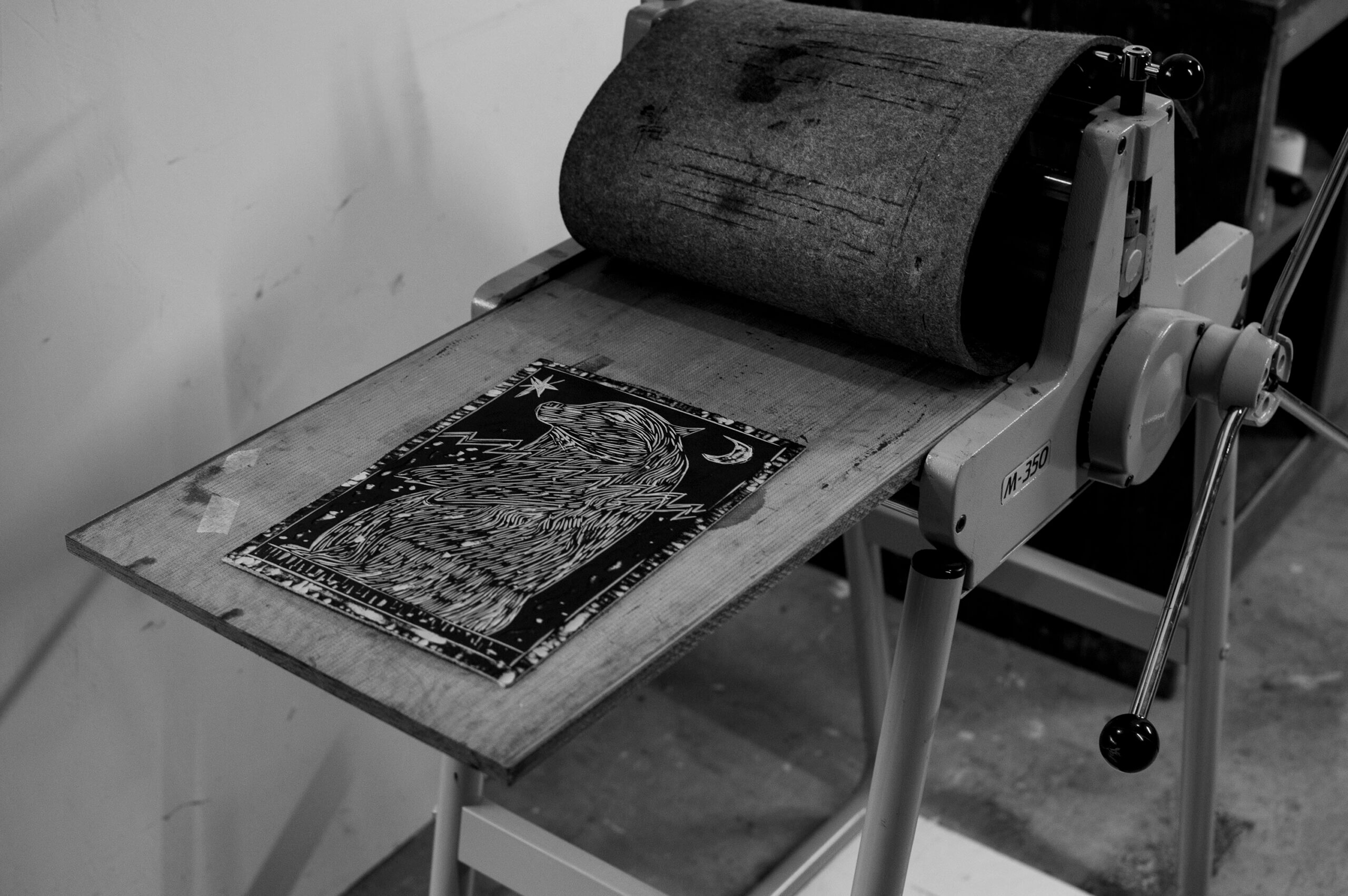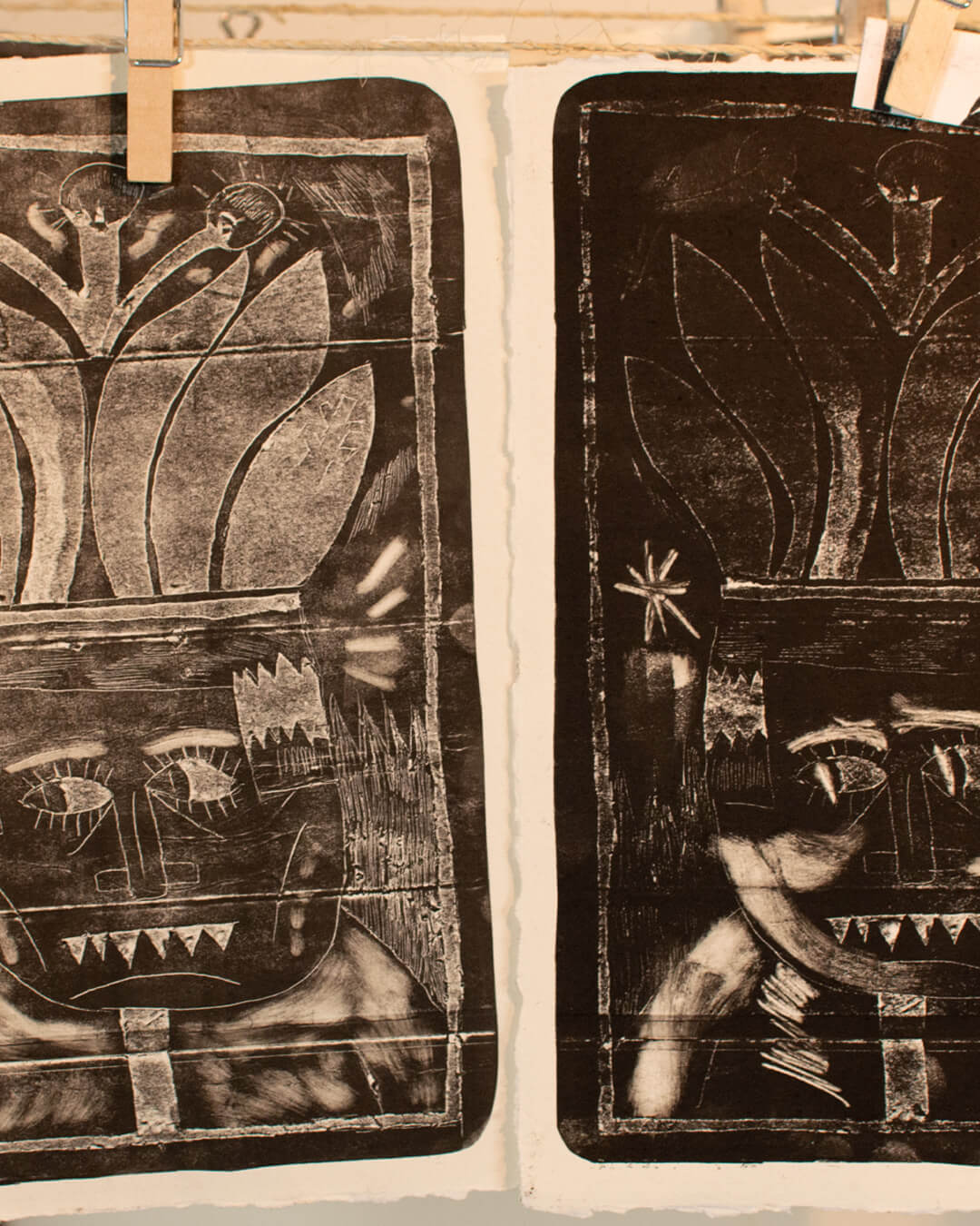 I was invited by Faust Lamauve to work as a resident for a week in her workshops in St Cyr sur Morin near Paris. During this residency, I delved into the depths of linocuts and made a start on my development in ceramics and, with that, spatial work.