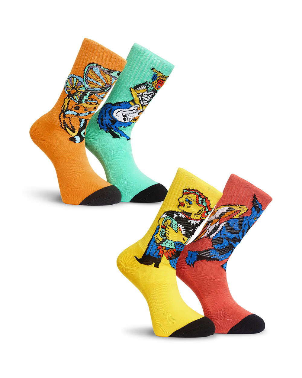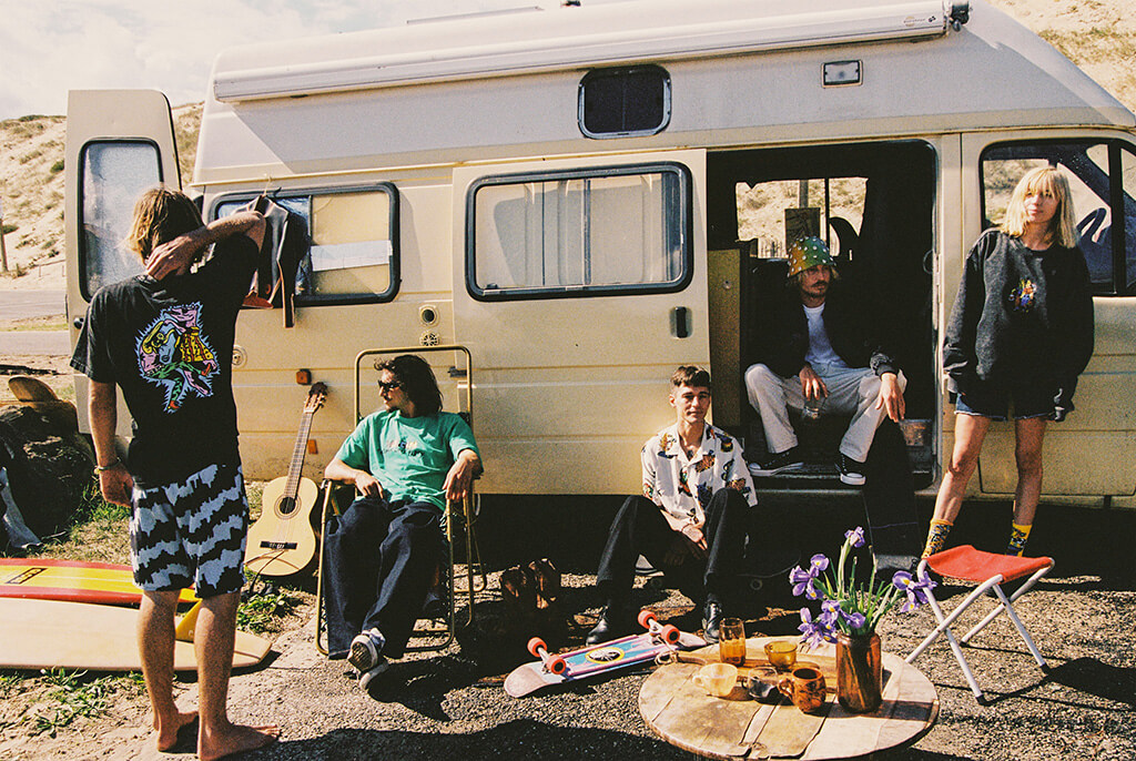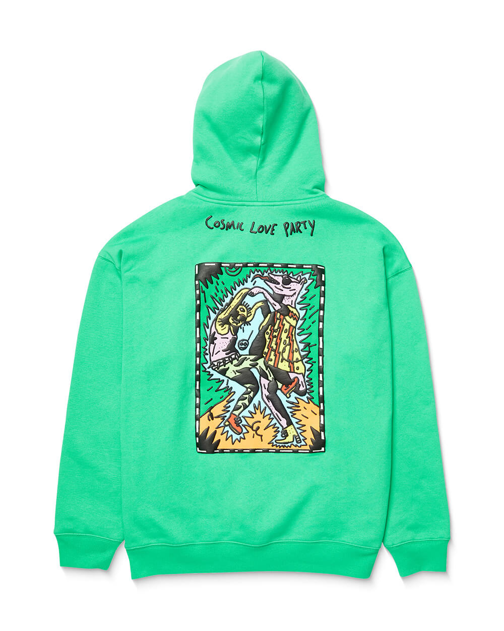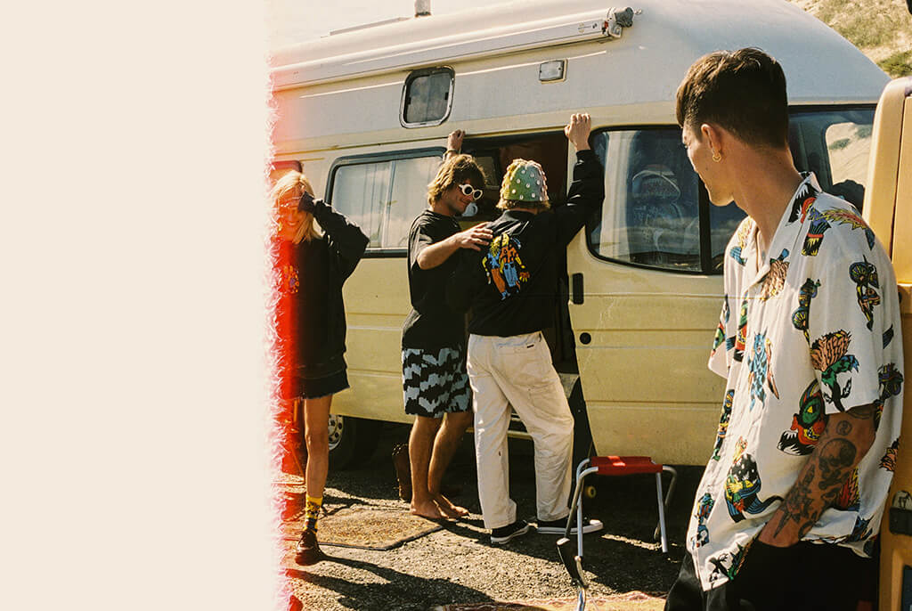 Volcom came to me a second time, offering a single line from a poem as the seed for a new collection. Something about it felt like a spark—quiet, but insistent. From that line, a vivid world started to unfold. I saw colourful warriors moving through shifting skies, cosmic mushrooms glowing under starlight, strange figures in motion, and moments of love suspended in space.